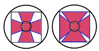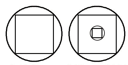 | Paso 1: Dibuje un cuadrado dentro de un círculo. | Paso 2: Dibuje un círculo concéntrico y inscribe otro cuadrado dentro del nuevo círculo, cuyos lados sean paralelos al cuadrado exterior. |