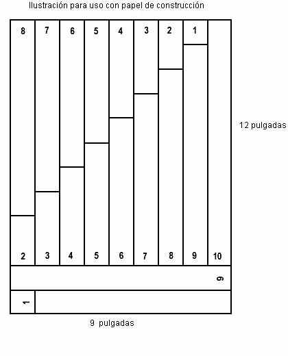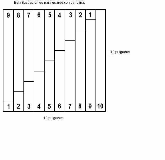 Con frecuencia, la introducción a los números se realiza a través de contar. No obstante, el uso de las "Tiras Cuisinaire™" (así como de las barras de K. Stern) introduce la suma de números como una adición de longitudes, haciendo énfasis en una interpretación geométrica de los números. Tal enfoque tiende a postponer el nombrar a los números, sirviendo con frecuencia como preparación para un aproche más formal. Así, usamos las Tiras Cuisinaire™ de forma similar, aunque con algunas diferencias. 1. 1. Construyendo un juego de Tiras Cuisinaire™ El maestro enseña a los estudiantes el patrón, explicándoles lo que han de hacer. Luego los estudiantes dibujarán el patrón, escribirán los números, y cortarán las tiras. Debieran escribir sus nombres en el sobre, cerrándolo después con un sujetapapeles. También sería ideal que los/as niños/as usasen cartulina (o papel de construcción), de colores distintos a los de los estudiantes que se sientan cerca de ellos/as, de forma que no se mezclen las tiras. Las ilustraciónes de abajo son