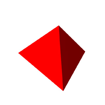 | Cada uno de los tetraedros menores de color rojo se separa, cuando un plano corta a través del tetraedro mayor. | El "plano de cristal," paralelo a una de las caras, al pasar a través del tetraedro mayor, origina la desaparición del tetraedro menor, como se muestra en la imagen de la izquierda. | ||||