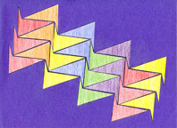 Usaremos aquí cometas para formar mosaicos con el plano. Para cubrir el plano, rote cada cometa 180° alrededor del punto medio de cada uno de sus lados. Tales rotaciones llenarán por completo el plano, con copias de la cometa. La figura que se observa arriba es un ejemplo. Imprima y coloree varias cometas idénticas, usando la página para imprimir que se halla más abajo. (¡O diseñe las suyas propias!) Para comenzar, aquí hemos incluído algunas imágenes.