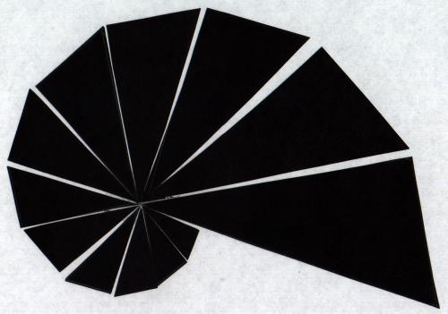 5. Recorte la tarjeta de forma que obtenga un rectúngulo cuyos lados midan a y b. Corte ahora por la diagonal. Después, cada miembro de cada pareja trabajarú por sí mismo/a, para construir su propio nautilo. 6. Usando un triúngulo de otra tarjeta índice, dibuje todas las líneas necesarias en su tríangulo. Deberú obtener un número n + 1 de triúngulos similares; el último se desecharú. 7. Corte a lo largo de las líneas dibujadas, y forme una espiral. Colóquela en el centro, con un cuadrado de cinta adhesiva. ¡La precisión en sus trabajos es muy importante!