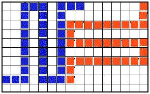 2. Necesitará hacer dos polígonos en la tarjeta, cada uno conteniendo 33 cuadrados. Un polígono es el reflejo del otro. Uno de ellos tiene forma de s con salientes verticales en sus extremos, mientras que el otro tiene forma de una s inversa, también con salientes en sus extremos. Para emparejar ambos polígonos en su rejilla habrá de girar uno de ellos 90 grados. Abajo se muestra el diseño de una de las posibles formas en que los polígonos se pueden trazar.