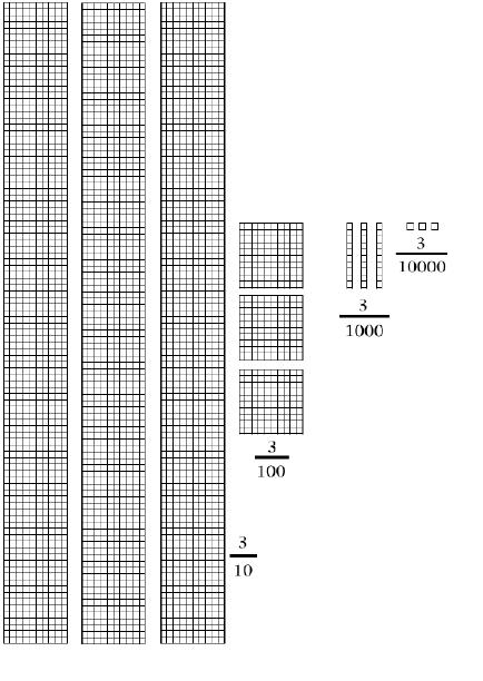 | Introducción Antes de enseñar esta unidad a los niños/as debieran saber que, para calcular 1/3 se ha de dividir 1 entre 3, y que la calculadora mostrará la respuesta como .3333333. La cuestión aquí es por qué. La respuesta, claro está, es porque 1/3 = 3/10 + 3/100 + 3/1000 + ... Pero ésta no es la respuesta que tenemos en mente. Queremos enseñarles a los/as estudiantes a dividir un pedazo de papel entre tres niños/as, a través de cortarlo en 10 tiras. Algunos niños/as verán la analogía con 1/3 como mostraba la calculadora, mientras que para otros ésta no será tan obvia. Actividad Los/las estudiantes trabajarán en grupos de tres. Cada grupo necesitará un decímetro cuadrado de papel (10 cm por 10 cm), dividido en milímetros cuadrados. (Otras unidades de medida son también válidas, siempre que sean múltiplos de 10.) Ver la Figura 1. Cada grupo necesita un par de tijeras y pegamento. Además, cada niño/a tendrá una hoja de papel en la que pegar sus tiras. 1. Cortar el cuadrado en 10 tiras iguales (Ver