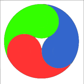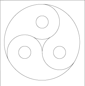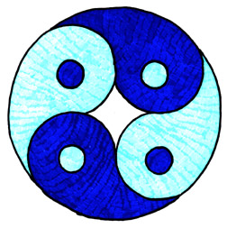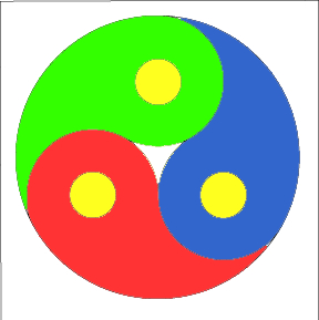 Puede dibujar un yin yang con cuatro partes, ó con un número n de partes. Abajo puede observar un yin yang, obra de Pollyjean Anderson, una maestra en entrenamiento, estudiando el curso Math 112. Para realizarlo, comience sus cuatro círculos congruentes en los vértices de un cuadrado, en lugar de un triángulo.