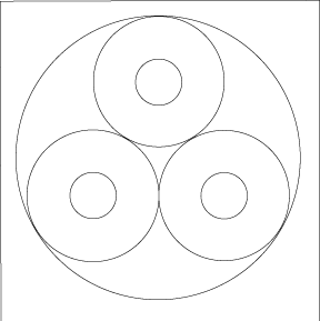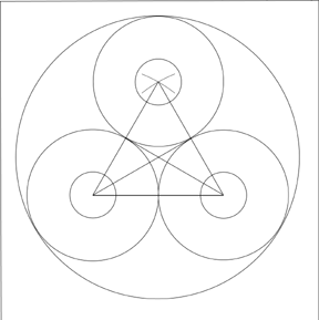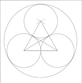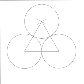 3. El siguiente paso será el circunscribir un gran círculo, alrededor de los tres círculos. Para ello, localize dónde se hallará el centro del círculo mayor. éste puede hallarse a través de dibujar dos líneas que vayan desde el punto medio de un lado del triángulo equilátero hasta sus vértices opuestos. Donde se unen estas tres líneas es el centro del círculo mayor. Cuando dibuje este círculo mayor, éste ha de tocar ligéramente a los tres círculos menores.