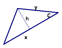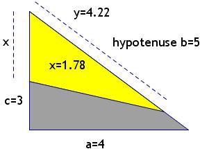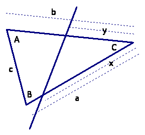 If there is a solution to the problem, then a dividing line separates the triangle into a smaller triangle and a quadrilateral (see the picture above). We name the sides of the large triangle a, b, and c, and the angles A, B, and C, as shown in the figure. These are constants because they are known values. We label the lengths of the two edges of the smaller triangle x and y. They are variables whose values are to be found.