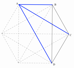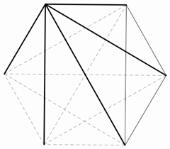 draw a regular hexagon with all diagonals, you draw 15 segments, 6 sides, 6