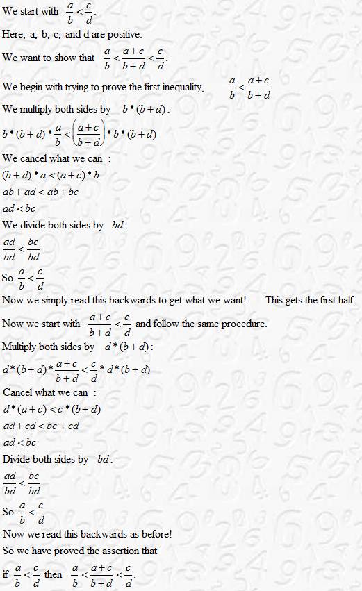 Given that a/b < c/d, why is it true that a/b < (a+c)/(b+d)< c/d?