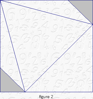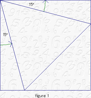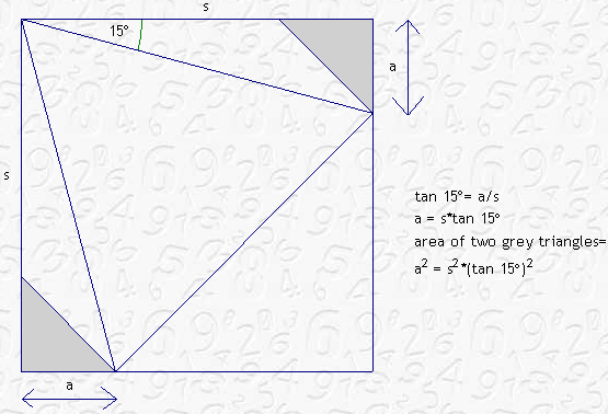 What is the area of the two tall skinny right triangles in figure 1, as a function of the length of the edge of the square, s? (This requires the use of a calculator with trigonometric functions. We used the TI-34 II.)(s2 - s2*(tan(15)2)/s2)/2 = (1 - (tan(15))2)/2