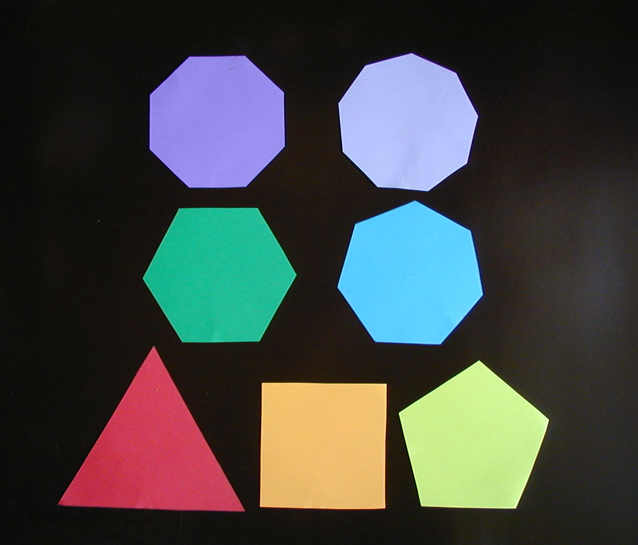 Design, cut out from colored construction paper, and display in the classroom a collection of regular polygons.All the polygons must have the same area.The suggested area is A = 20 square inches, but other values are possible, and their choice may depend on the supplies that are available.1. Analysis of the problem.