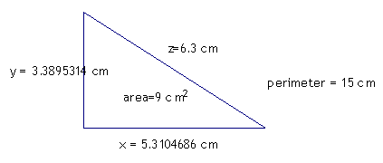 Construct from an index card a right triangle that has area 9 square centimeters, and perimeter 15 centimeters.