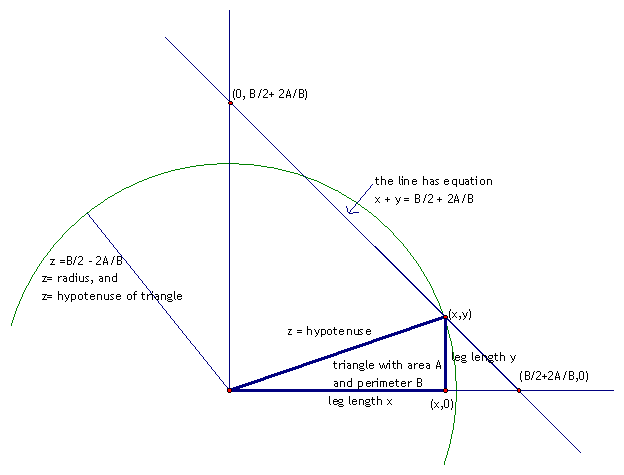 Let A be the area of a right triangle and let B be its perimeter. We want to find the legs x and y of the triangle, and its hypotenuse z.