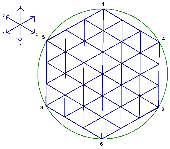 First task. Design the board above on poster board or paper or card stock. It should be rather large-- start with a circle with radius 9 cm. The side of a "small triangle" should be 3 cm long. (It is better than 1 inch.) The six directions should be indicated by arrows in the six corners of a big hexagon and marked with the numbers 1 to 6. A good pairing of opposite directions is (1, 6), (2, 5), and (3, 4), the same as on a die.