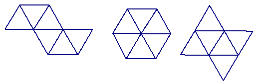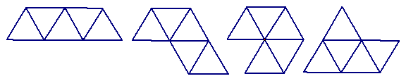 For each whole number n from one to ten, draw a net of n equilateral triangles with sides one inch long. and cut it out from an index card, cardstock, or poster board. For the numbers 1, 2, and 3 there is only one such net. For the number 4 there are three nets. Can you draw all nets for the numbers 5 and 6? Be original and decorate your nets.