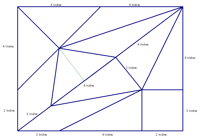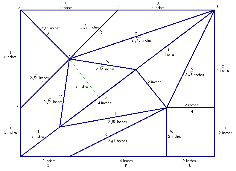 It is a 6 inch by 8 inch rectangle dissected into twelve polygons, each having an area of 4 square inches. The principle of its design is shown in picture two.
