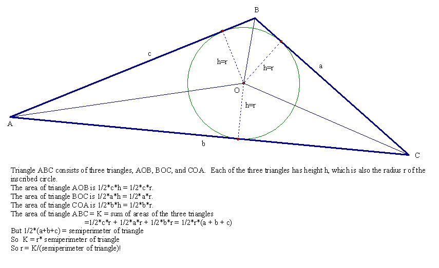This can be used as a step in the construction of the puzzle. (Here is a proof of the fact that the radius of a circle inscribed in any triangle with area K and sides a, b, and c (and thus semi-perimeter s = (a + b + c)/2) is K/s. From this fact it is easy to see that for a 6, 8, 10 triangle, the radius of the inscribed circle is 24/12=2.)