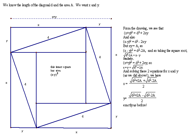 The Babylonians did not use algebraic notation, so all problems were worked out with specific numbers. Also, drawn pictures were used very sparingly. Thus the actual problem and its solution looked more like this: