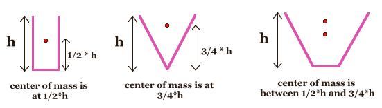 In the two extreme cases of inverted pyramids, the center of mass is at 1/2 and 3/4 of their height, and in all others it is somewhere in between.