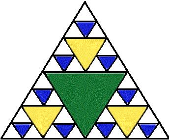 - Now you have nine uncolored triangles. Again, connect the middles of their edges and create nine central triangles, which you color blue.