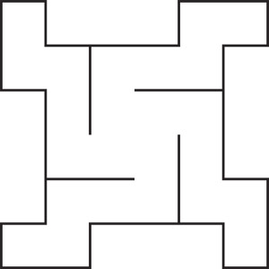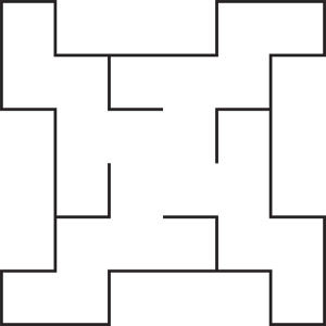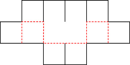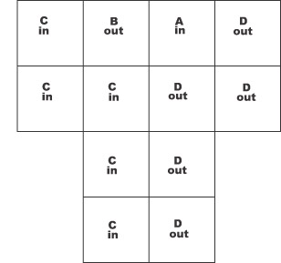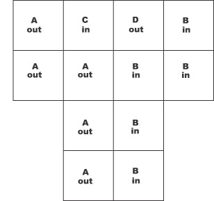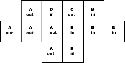 Make two congruent patterns (one from each card), as shown below. Label the squares A, B, C, and D as shown. Squares labeled by the same letter are faces of the same cube. “Out” means that the face should be folded so that it is on the outside of the cube, and “in” means that the face should be folded so that it is on the inside of the cube. Cut out the two patterns.