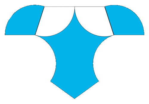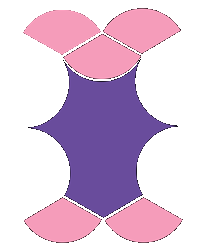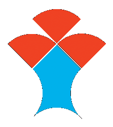 Using compass and ruler, or protractor or index card, draw a square approximately three inches on a side, using the two-colored posterboard. Before cutting it out, set your compass radius at one half the length of a side. Put the point of the compass on three different vertices of the square, and swing three arcs of 90 degrees. You should have a shape like this: