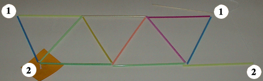 Cut 5 feet of twine, and tie a piece of paper 8 inches from the end. Form a triangle on your desk, and thread in the following order: A B C A B. Tighten the twine, and tie the shorter end to the longer end of the string in a location which will make straw C horizontal.