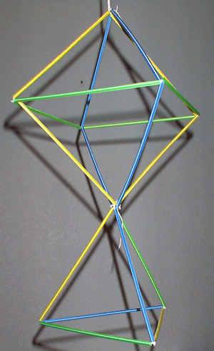 Threading is easy, but even small objects, such as tetrahedra, require a long piece of twine. Every polyhedron (or net) can be fixed together by one long strand of twine, and we do not know any reasonable design for which we would recommend more than three strands. But a long strand of twine gets twisted and tangled. So you have to constantly remember to untangle the "needle end" of the twine before threading it through the next straw. Also tie a small piece of paper or a small light object to the other end of the twine to prevent it from slipping into a straw. But the main difficulties are conceptual. Threading the twine to put a polyhedron together can be done in many different ways, but it is not arbitrary, so planning is important. But even if you make a good plan, what you see in front of you is a pile of straws, and you have to visualize the object you are making. This is very difficult for all children and for most adults. In order to overcome this difficulty, which can make the task impossible, you need teamwork.