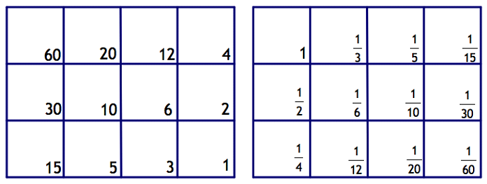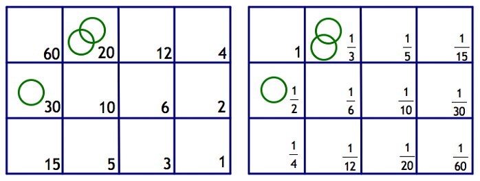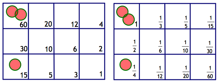 Notice that dividing each number on the whole number board by 60 yields the corresponding fraction on the fraction board.