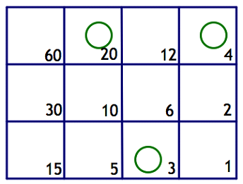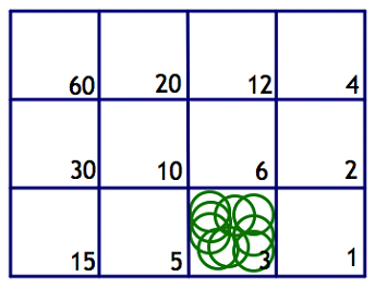 Now we regroup the tokens on the whole number board: 15 + 20 + 10 + 12 + 3 = 60.
