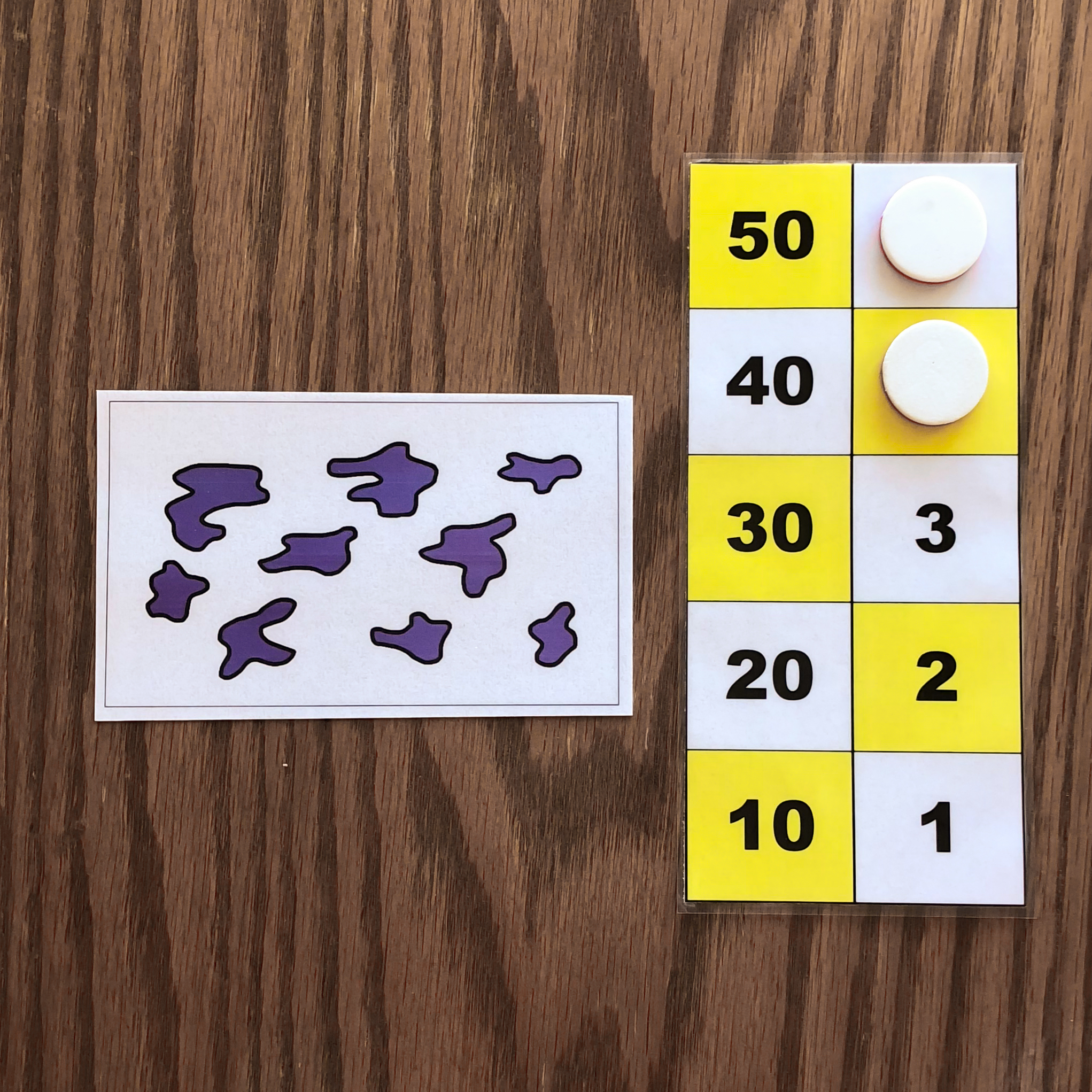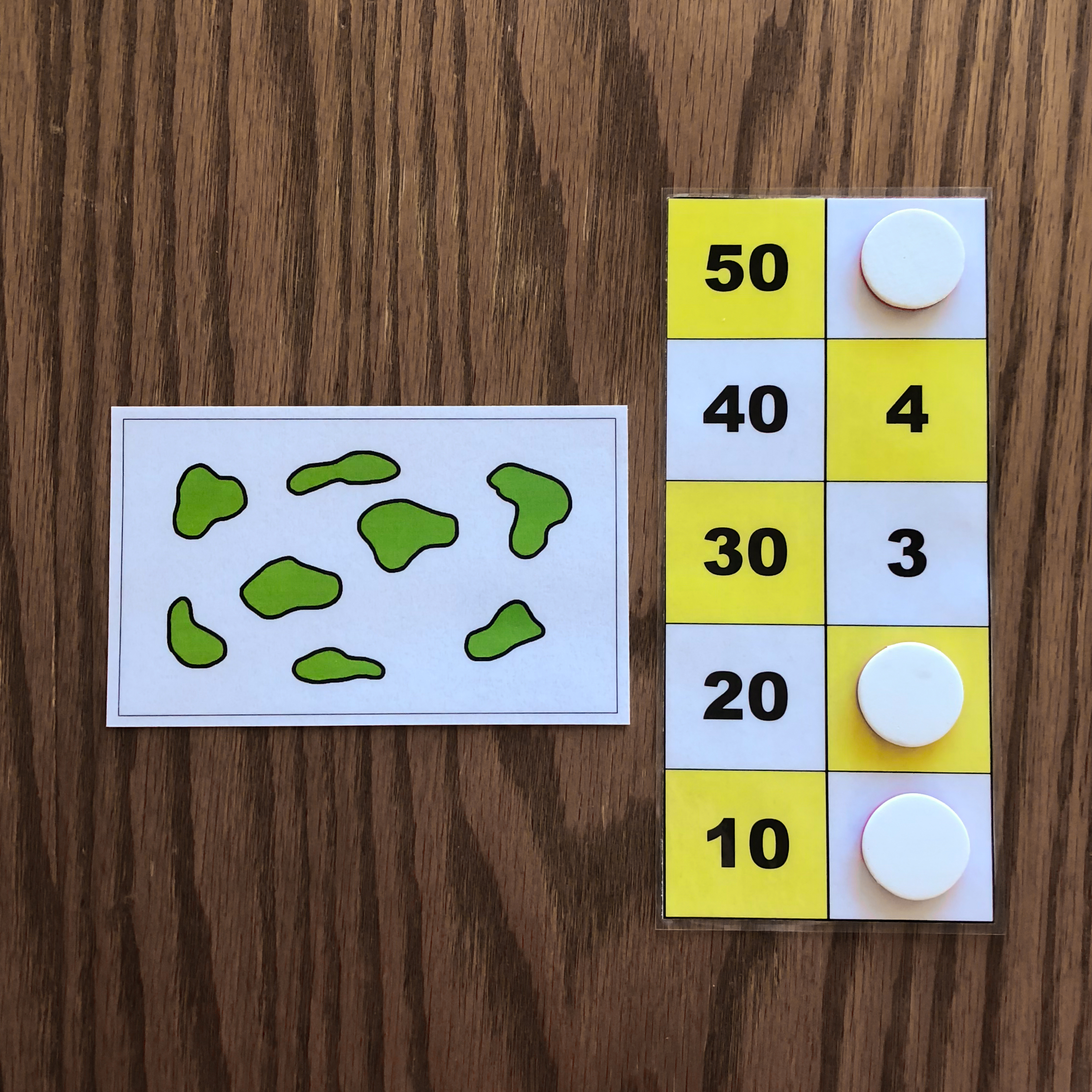 When given the first card, the child will represent the number on the board using tokens. In this example, the first card has 8 dots, so the child