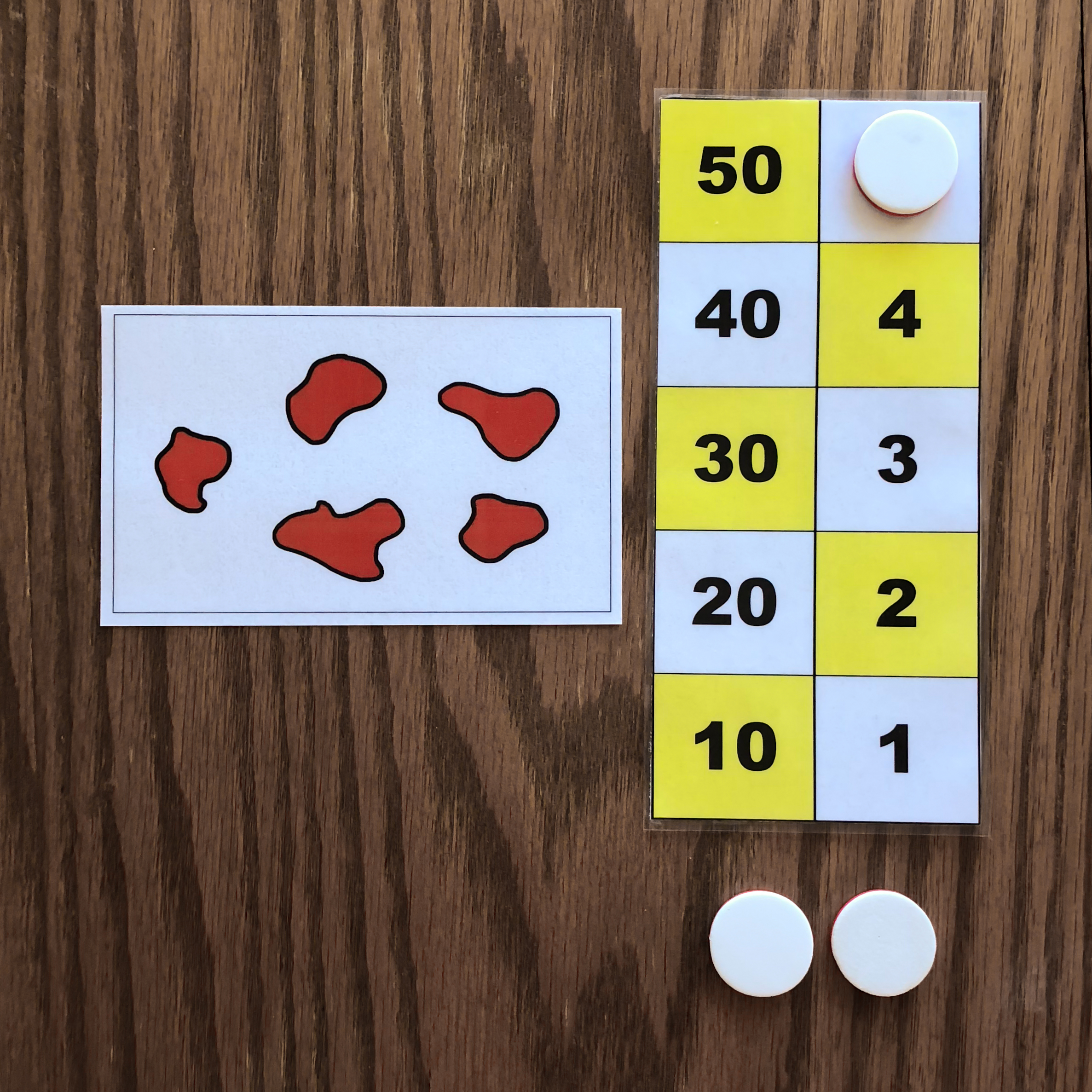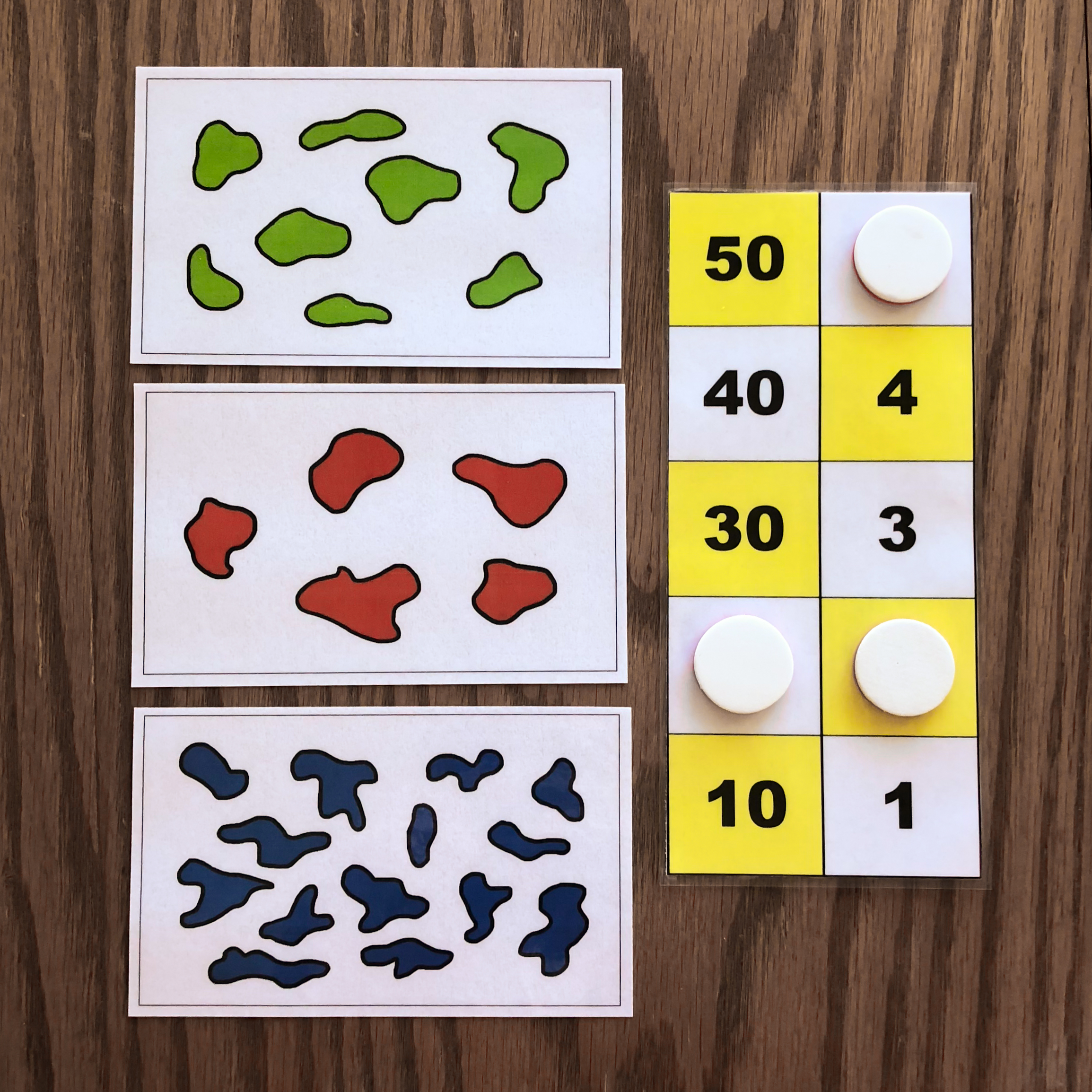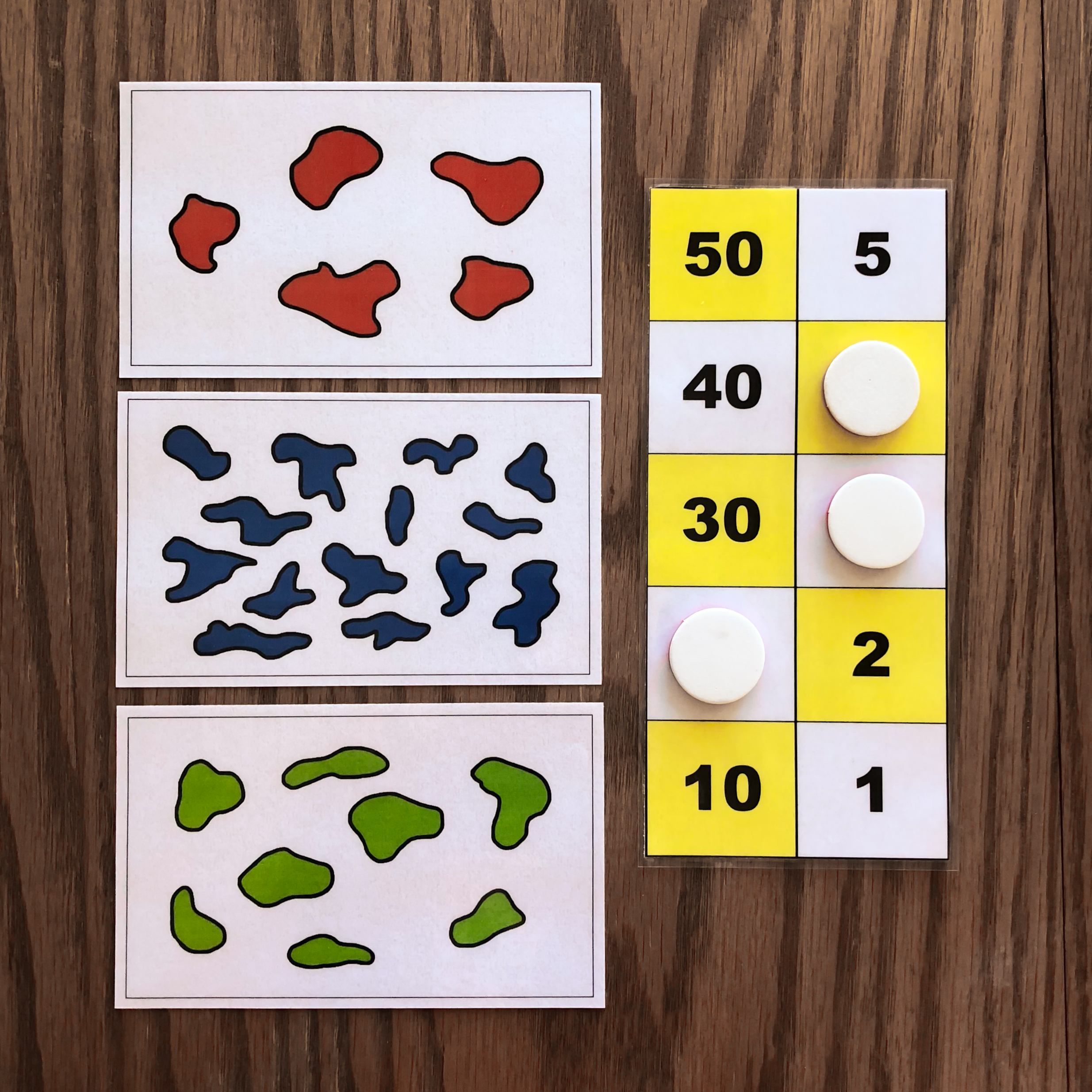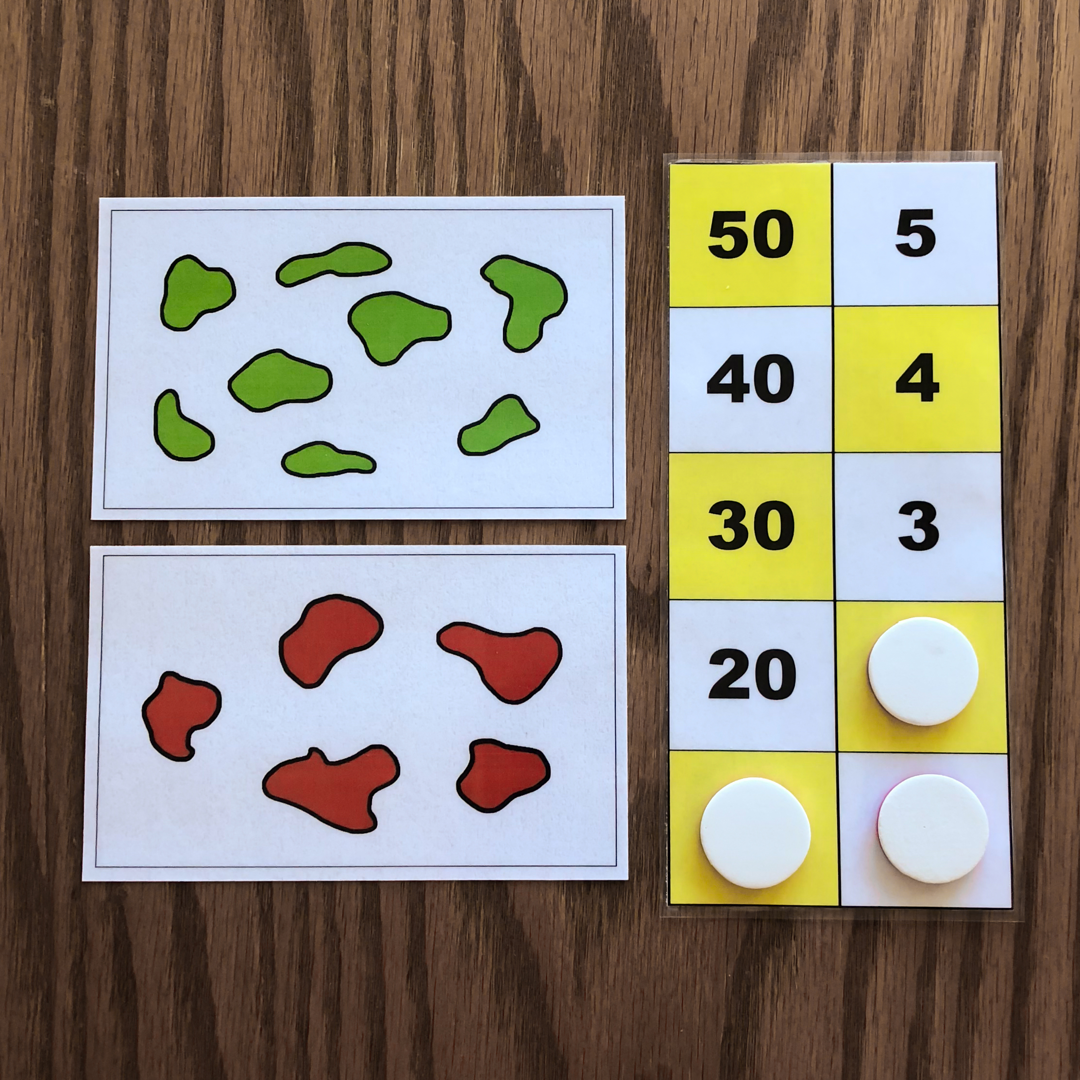 When given the first card, the child will represent the number on the board using tokens. In this example, the first card has 5 dots, so the child
