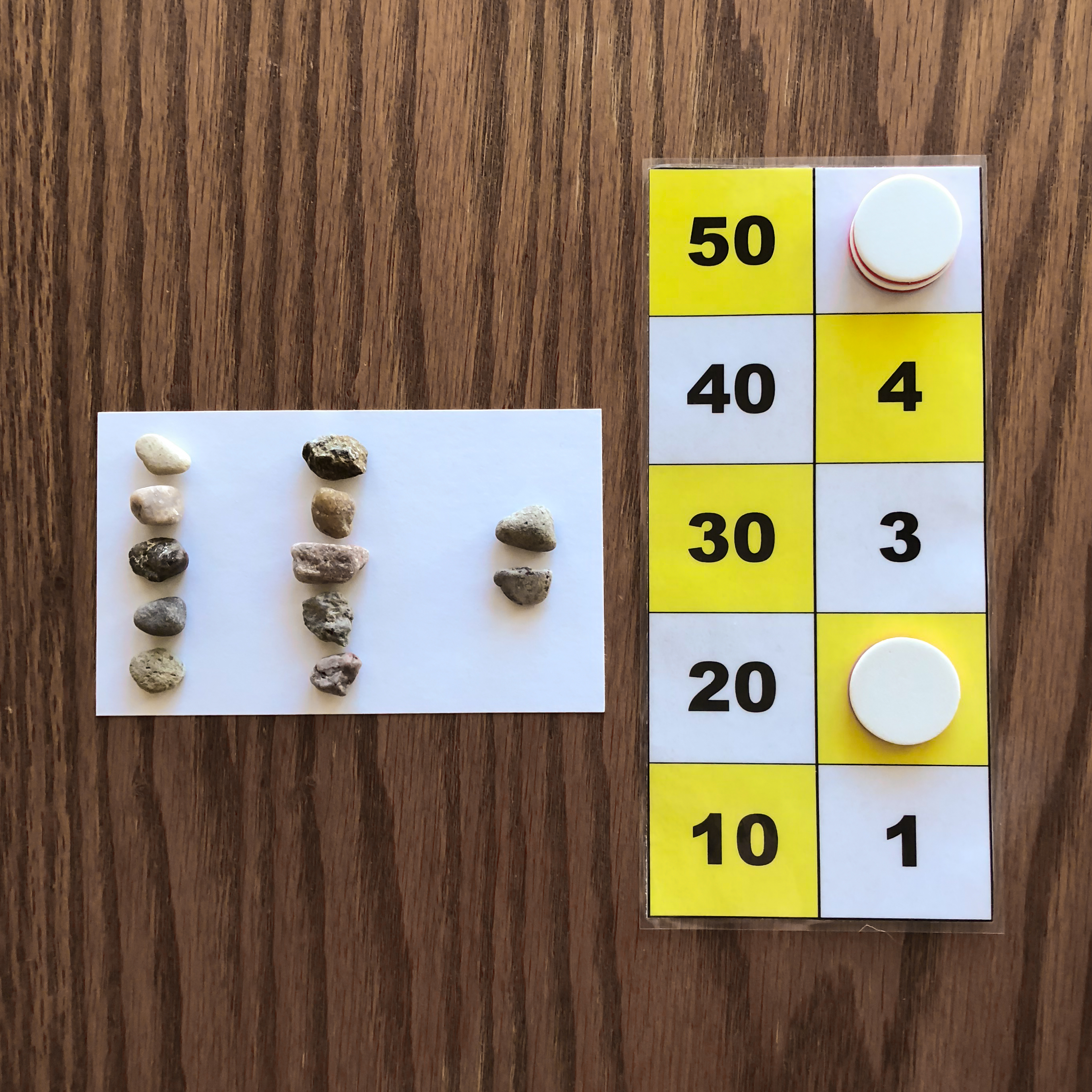 This image shows four groups of three rocks on the paper. This is represented on the number board by