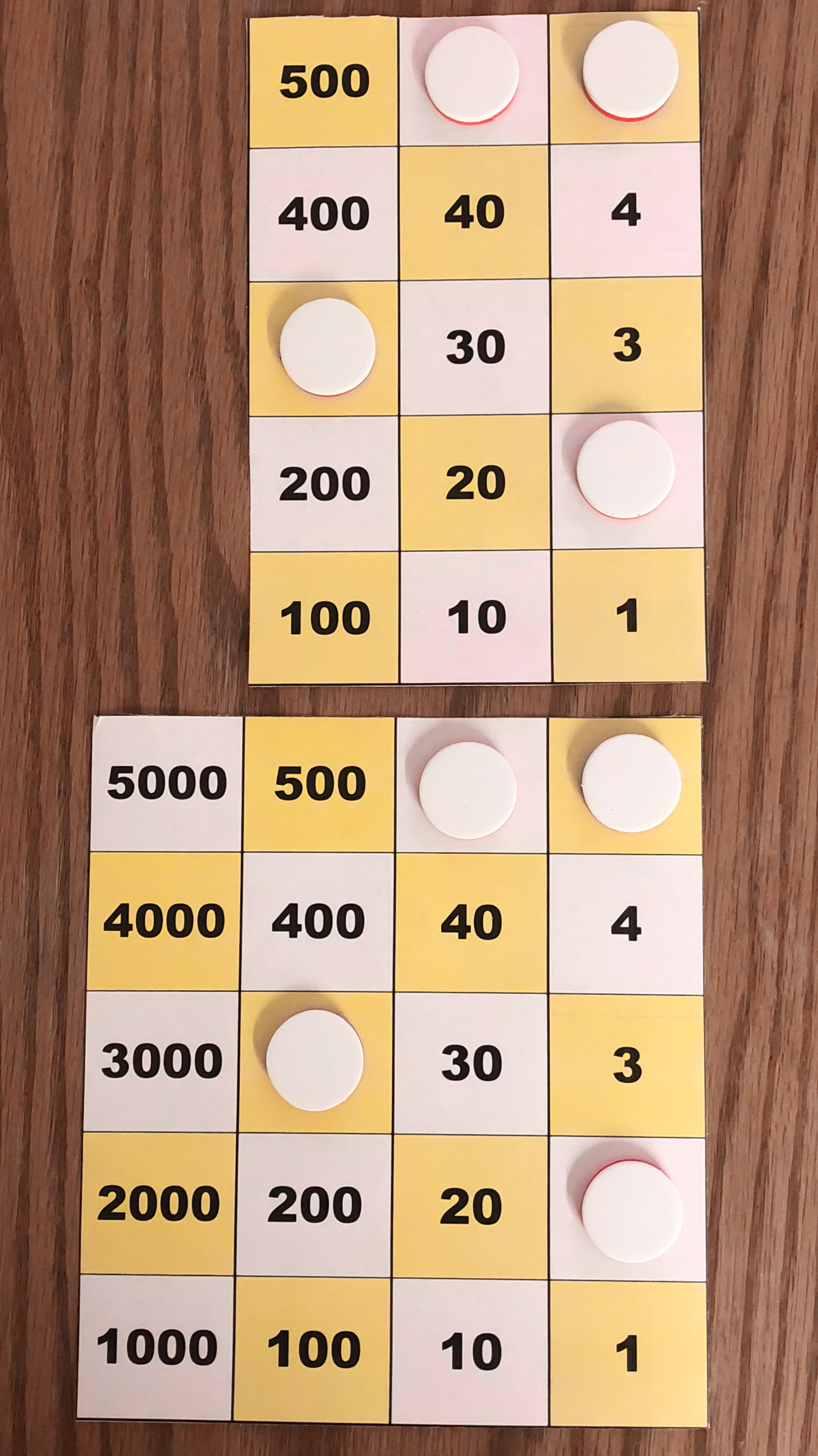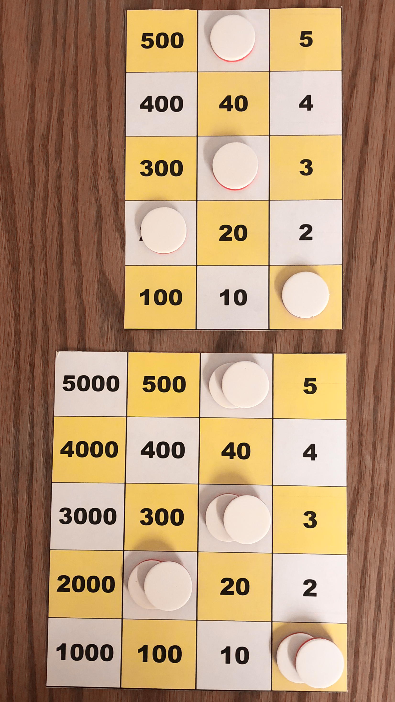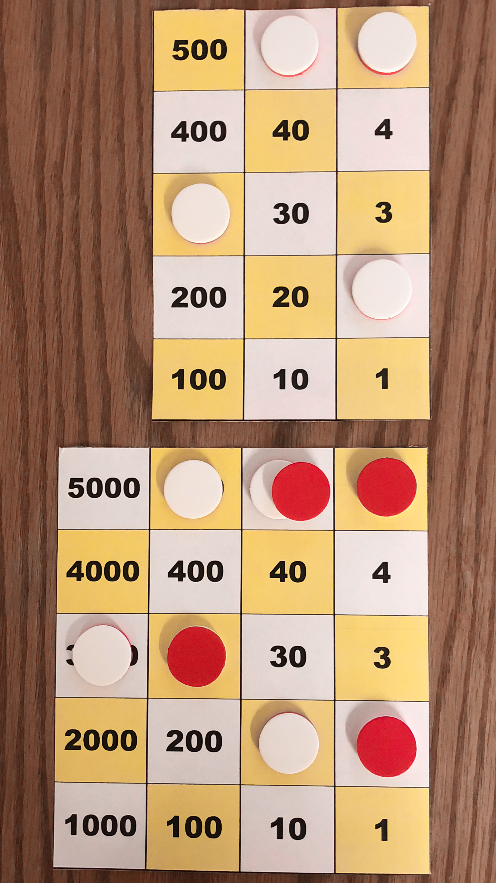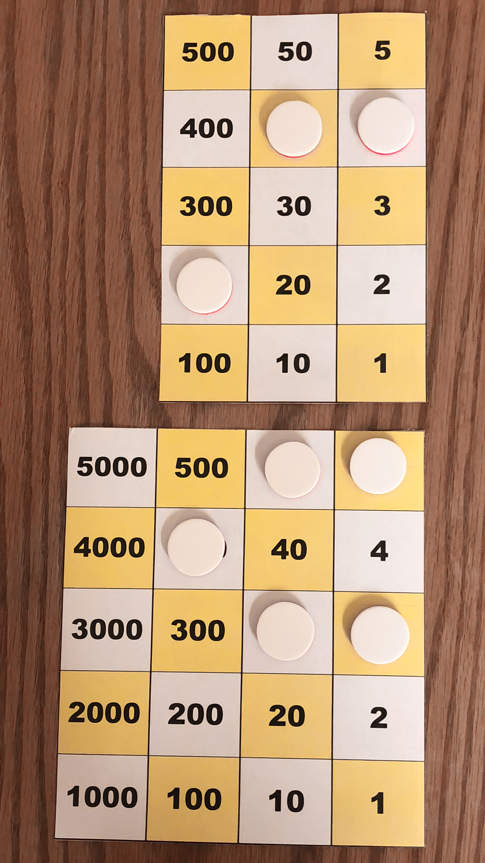 Board M holds 357. In the left image, Board P holds 10*357 using white tokens