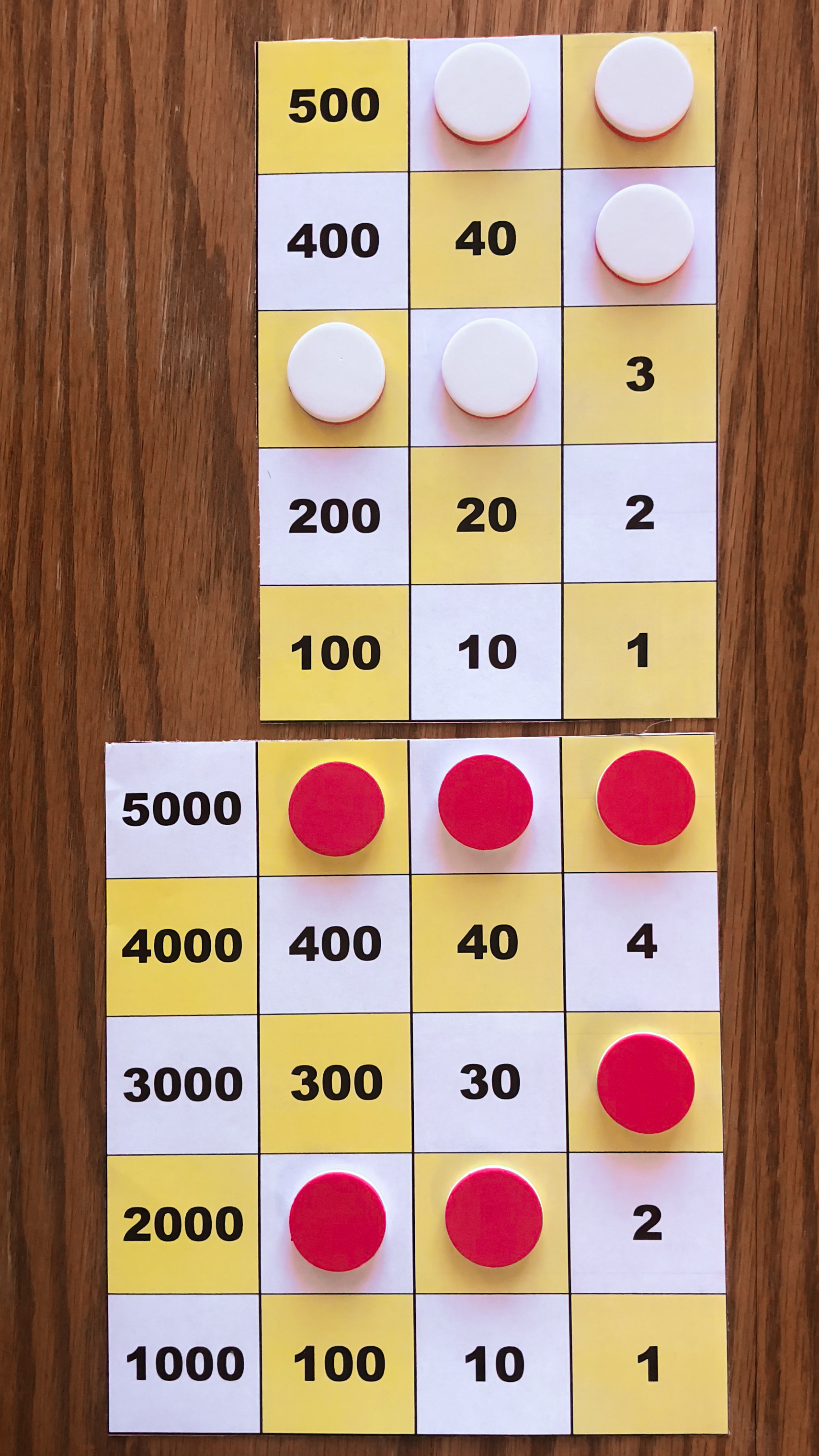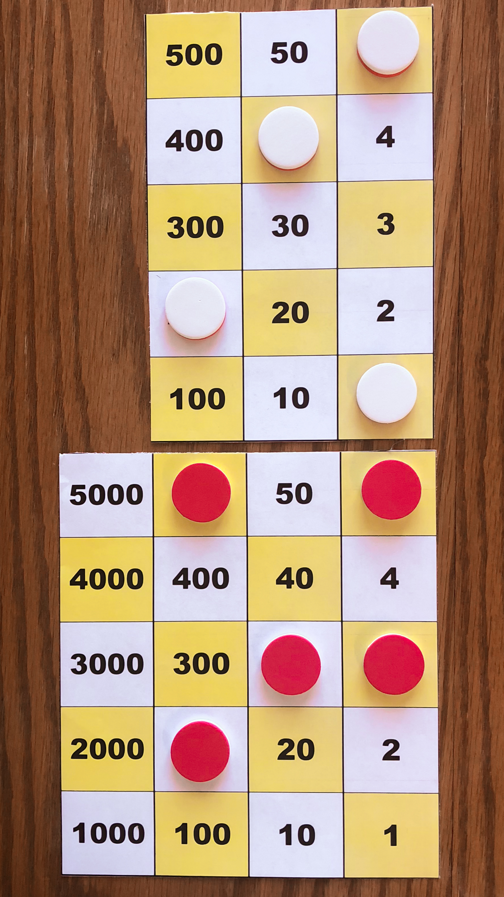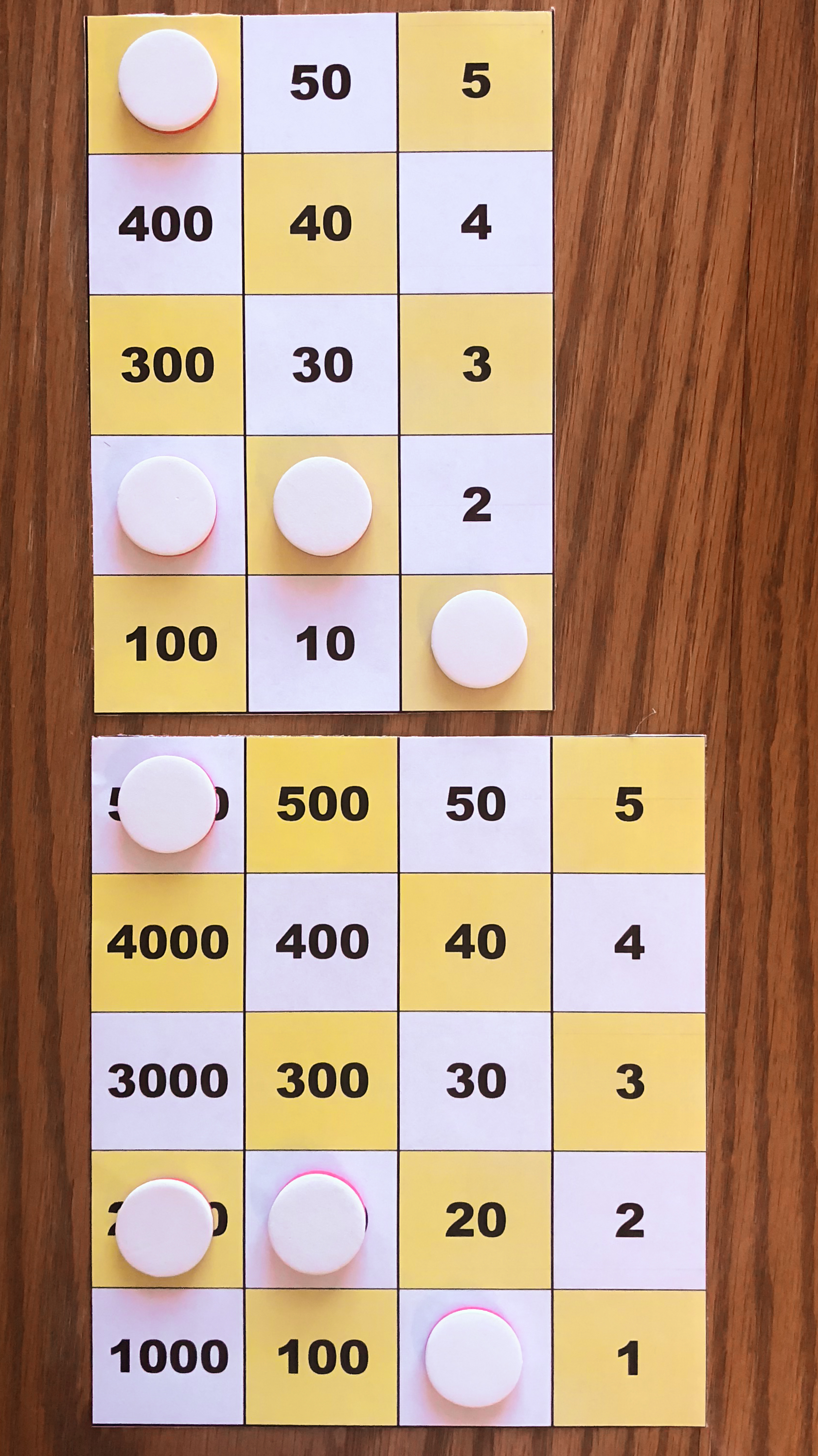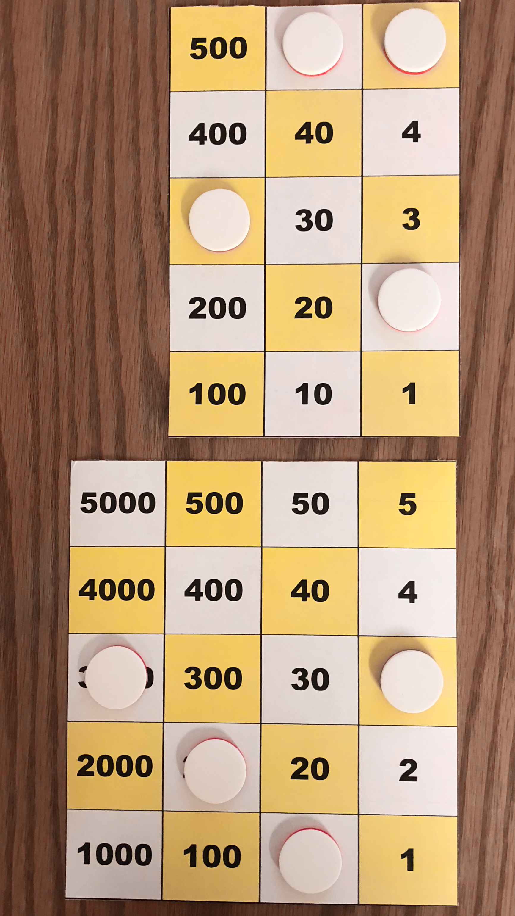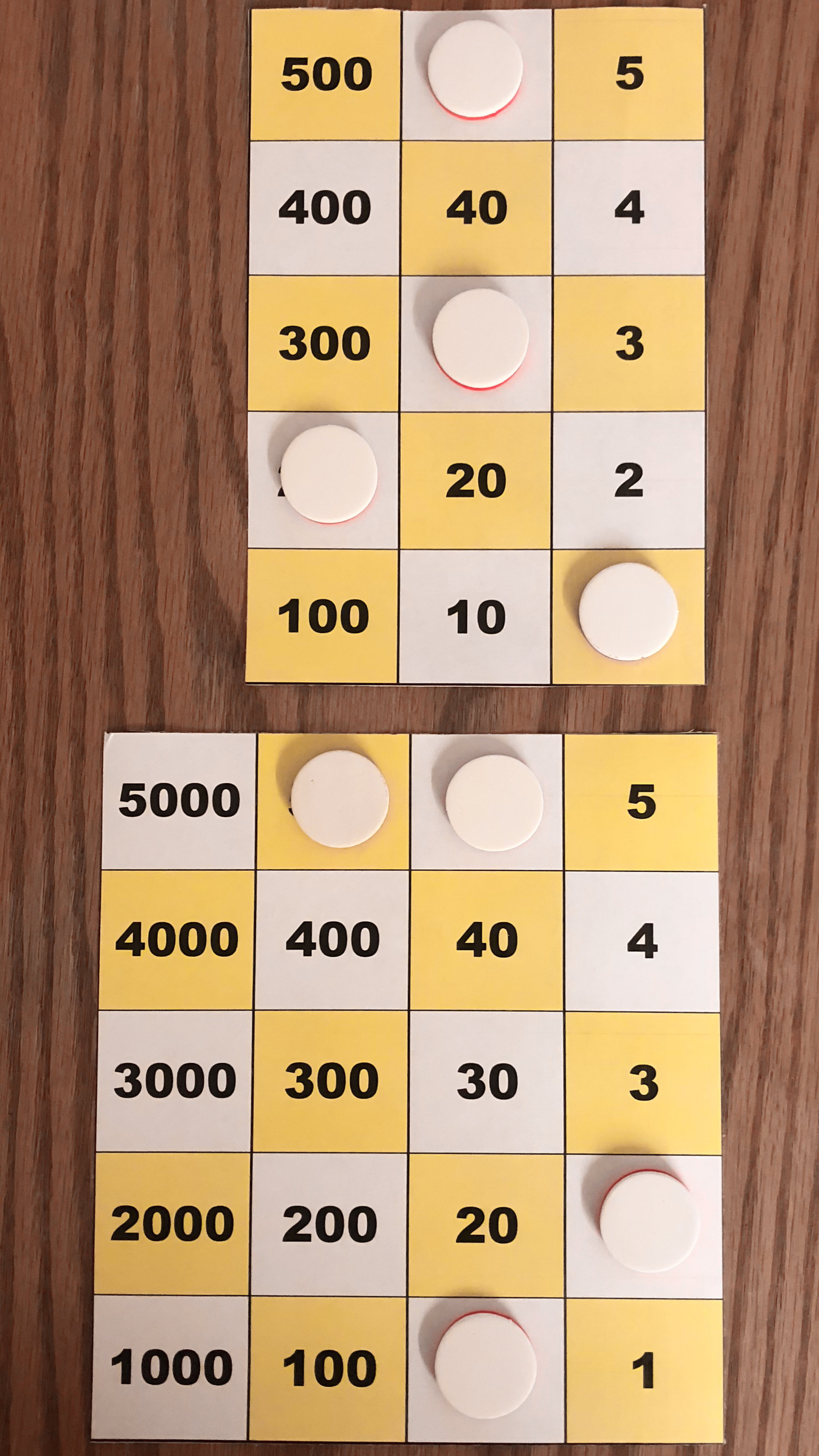 Board M holds 357. In the left image, Board P holds 10*357 using white tokens