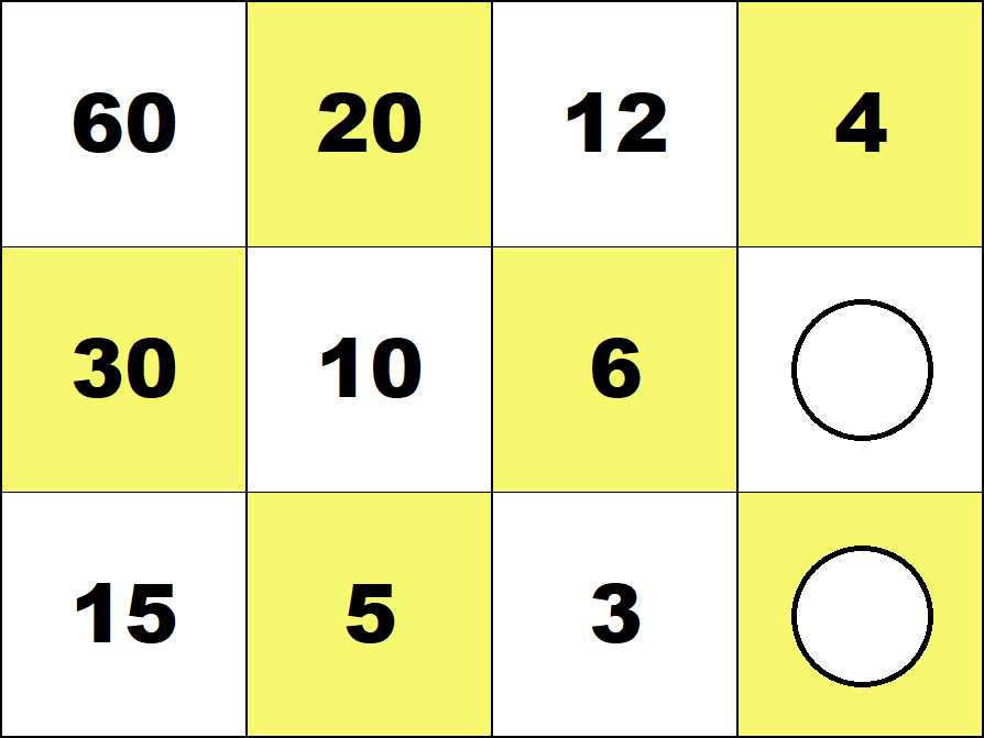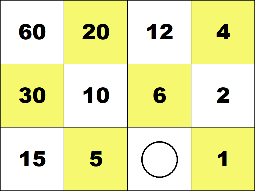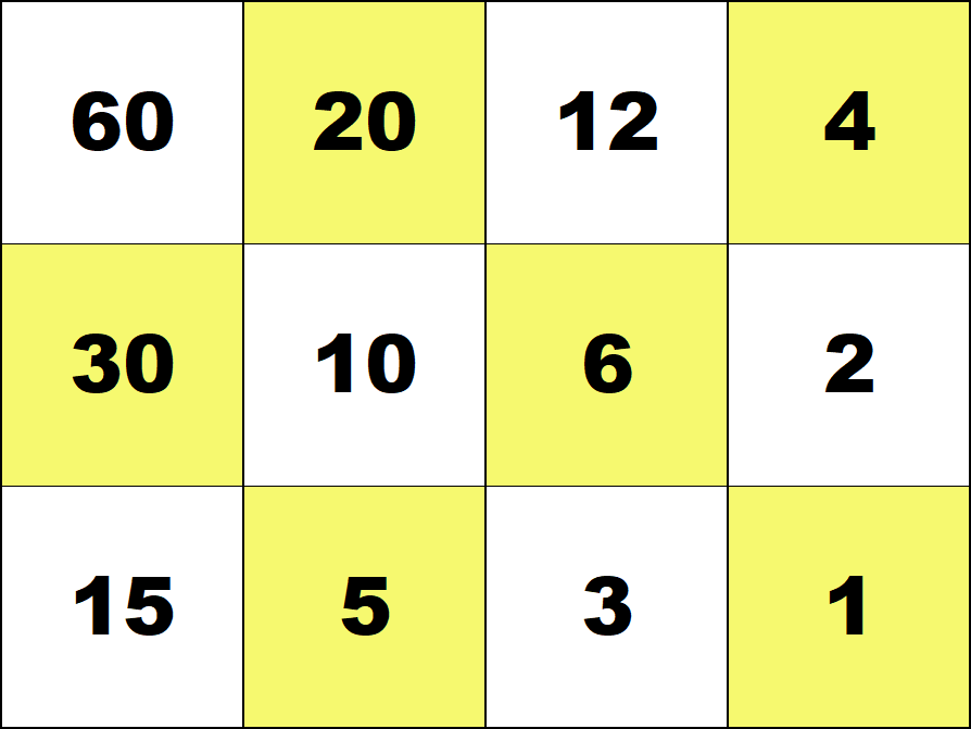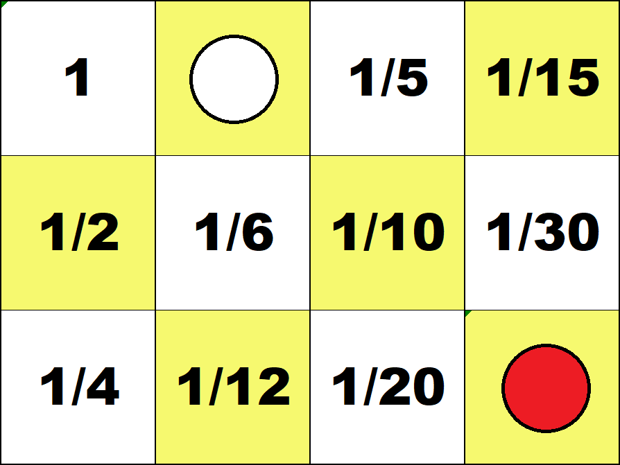 Represent all numbers from 1 to 100 with the smallest possible number of counters on the 3 by 4 integer board. (Use both white and red counters.) ![]() 29 = 30 - 1 ![]() 87 = 60 + 30 - 3 Represent all fractions 1/60, 2/60, ..., 59/60 with the smallest possible number of counters on the 3 by 4 fraction board. (Use both white and red counters.) ![]() 19/60 = 1/3 - 1/60 ![]() 51/60 = 1 - 1/10 - 1/20 Number Board index |