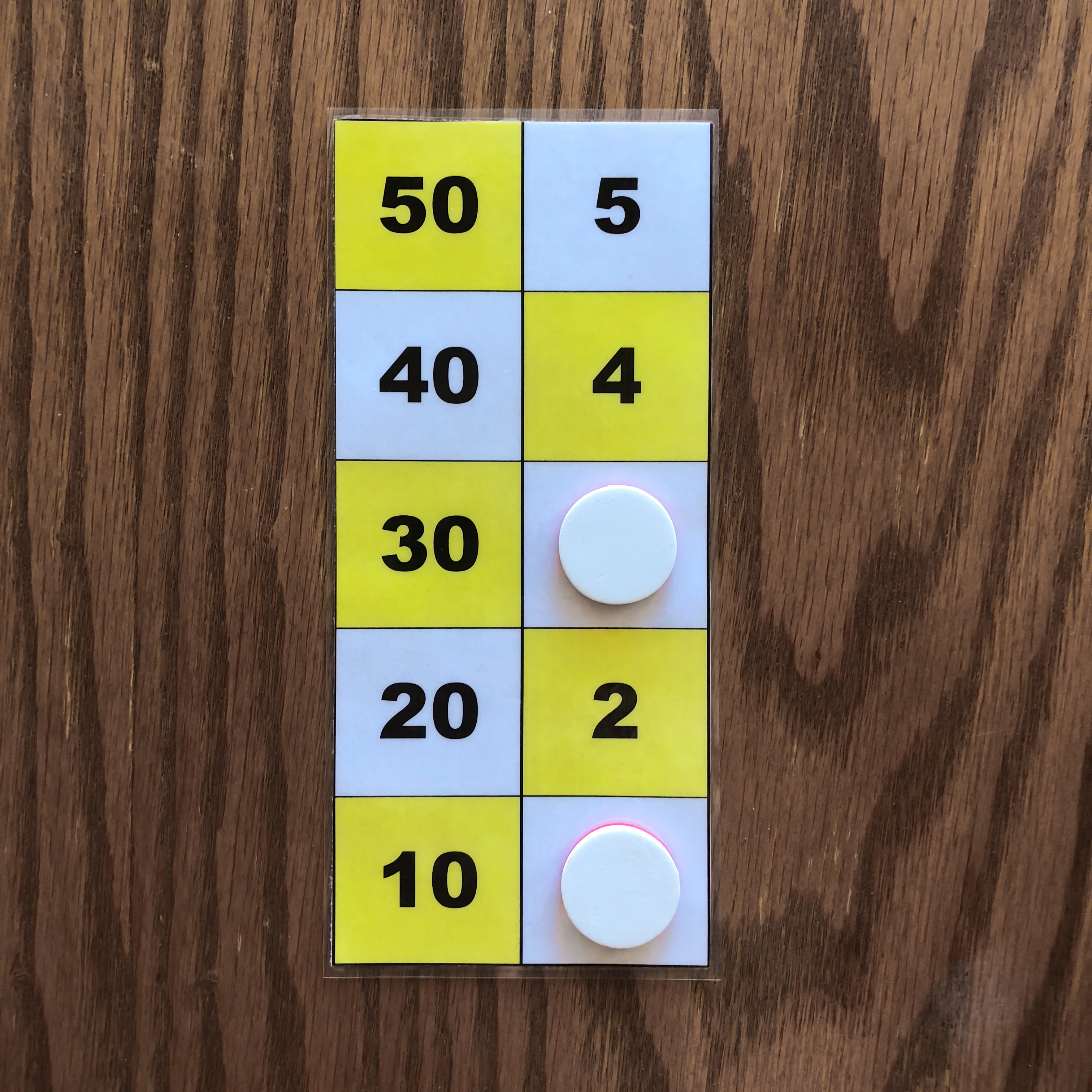 In the leftmost image, one counter on the 4 square and one counter on the 1 square represent the number 5. (4+1 = 5) In the second image from the left, one counter on the 3 square and one counter on the 2 square represent the number 5. (3+2 = 5) In the second image from the right, one counter on the 3 square and two counters on the 1 square represent the number 5. (3+1+1 = 5) In the rightmost image, two counters on the 2 square and one counter on the 1 square represent the number 5. (2+2+1 = 5) Number Board index |