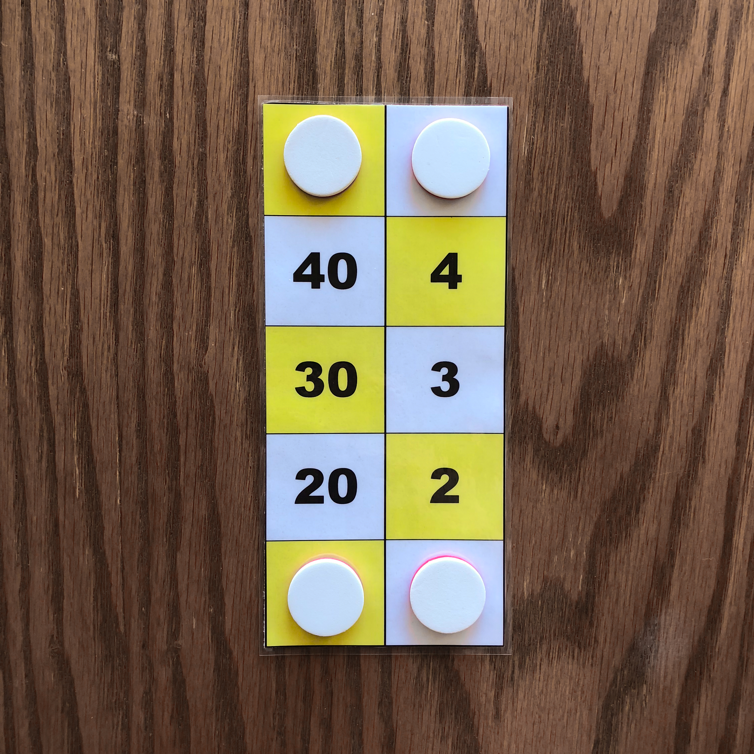 Two counters placed on the 1 square and one counter placed on the 2 square represent the number 4.