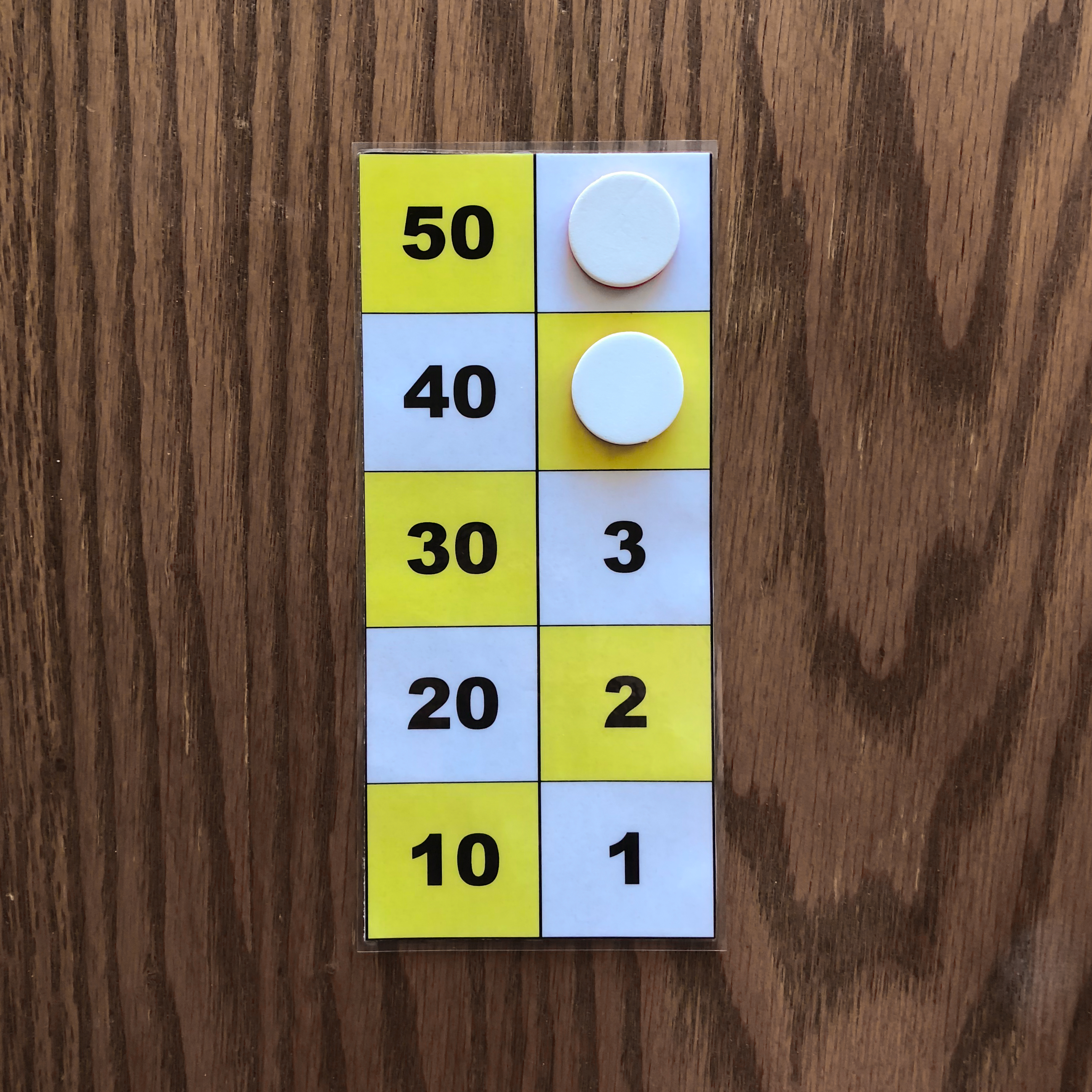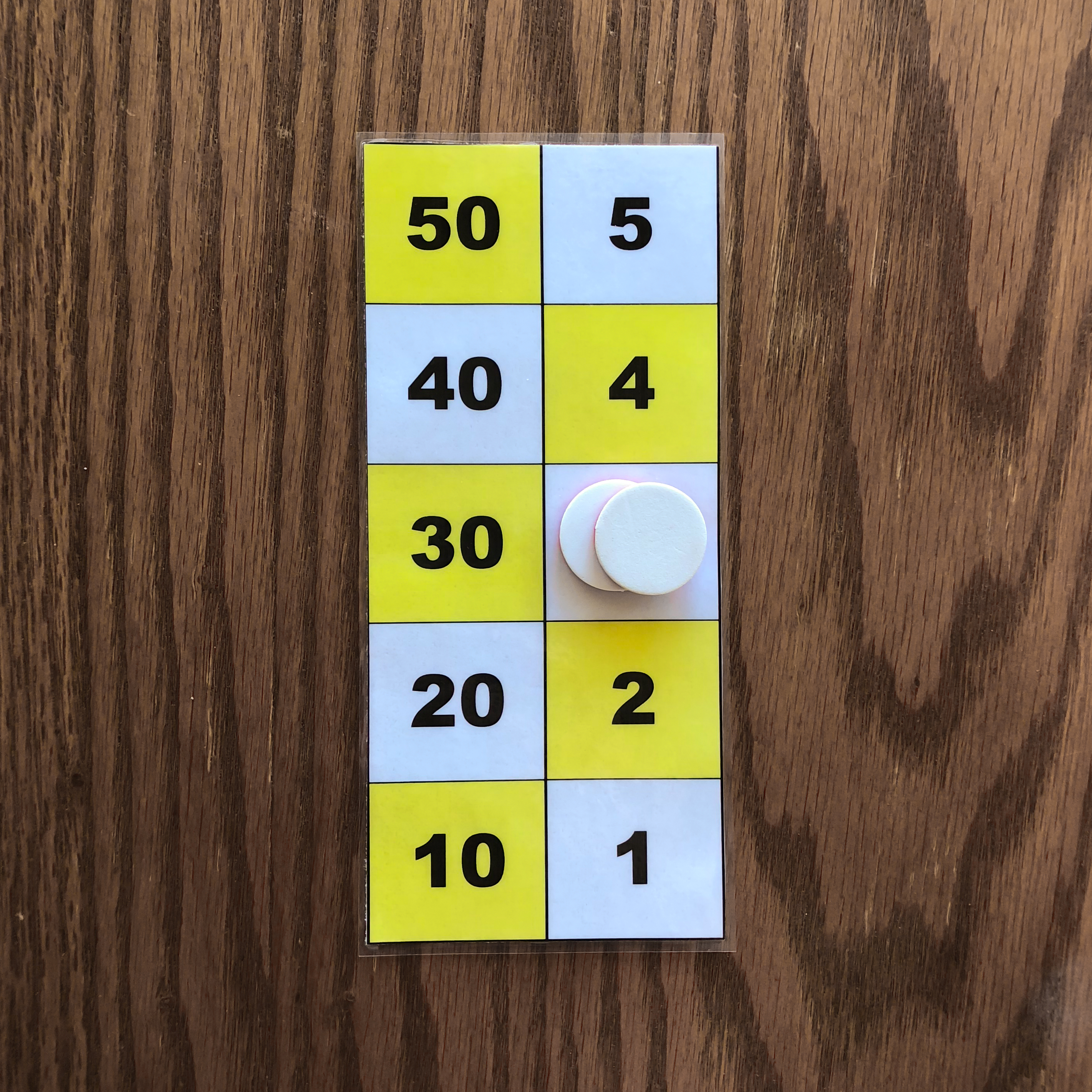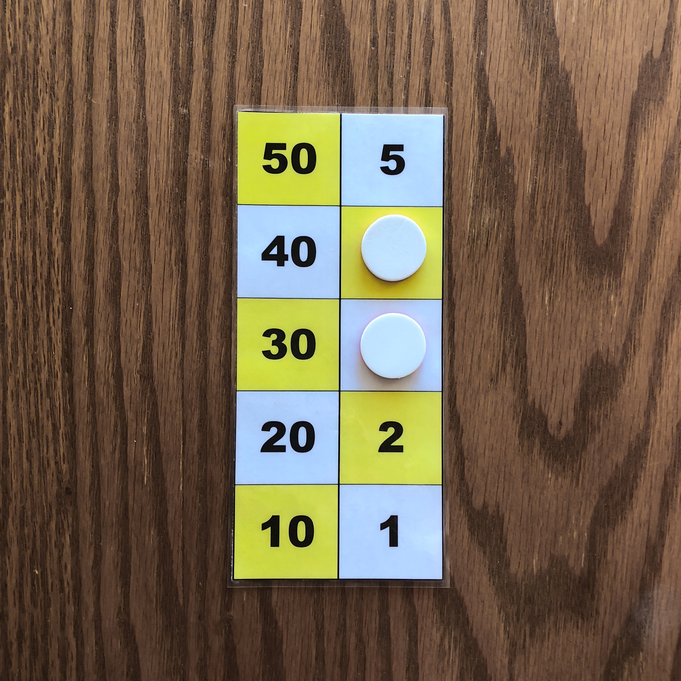 One counter on the 50 square, one counter on the 10 square, one counter on the 5 square, and one counter on the 1 square is one example of the number 66 represented on the board. 3. Representation of the numbers 1 to 5 with two or three counters.