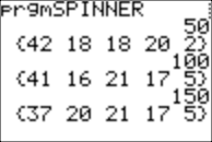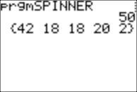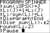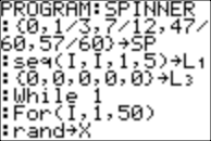 Here we will enter a program, SPINNER, into our calculators, see that it is used to simulate spins on a dial with sectors like those in Part 1, and run it to collect a lot of simulated data. We want to compute the theoretical frequency of outcomes for the dial, and see if the simulated data, after many spins, approach the theoretical frequency.