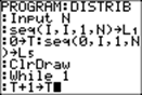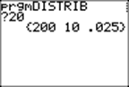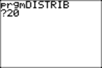 The program "DISTRIB" below simulates the toss of a 20-sided (icosahedral) die. Of course with 20 possible outcomes (the numbers 1 through 20) equally likely, each has a 5% probability of turning up. So the theoretical distribution will be a constant .05 for each outcome. What we want is to see how close to this distribution we can get by continually rolling the die over and over, in groups of 200 rolls. Each time we can look at the new distribution on the calculator screen. The program also tells us what the difference is in the number of tosses between the highest and lowest totals of tosses, and how far the current highest (or lowest) frequency of tosses is from the probability of .05 or 5%. If we stop the program, we can learn what the 20 actual frequencies are.
