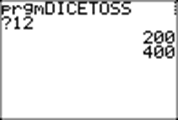 To run the program, select DICETOSS from the Prgm menu. You will see its name on the homescreen together with a ?. Type 12, to indicate that there are 12 possible outcomes. (Actually there are only 11, but we will start our count at 1 to make the screen easier to read.)
