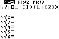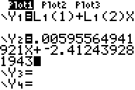 Let's put this equation in Y2. First put your cursor on Y2=. Then go to VARS and pick 5: Statistics. Then go to EQ and pick 1: RegEQ. It is copied into Y2=. Pretty handy!